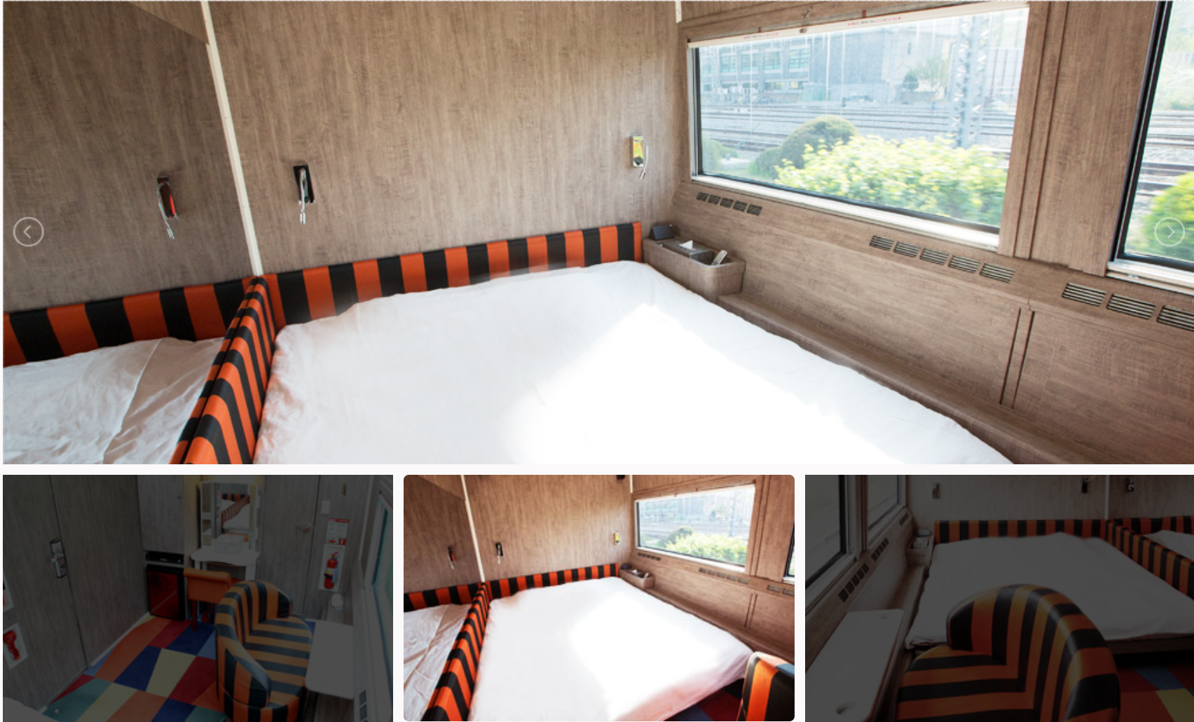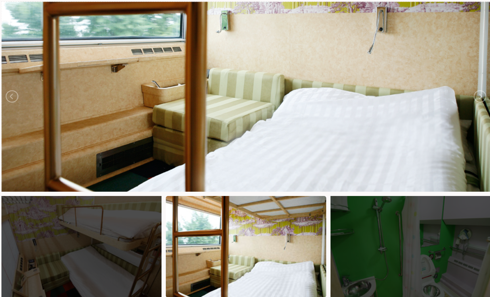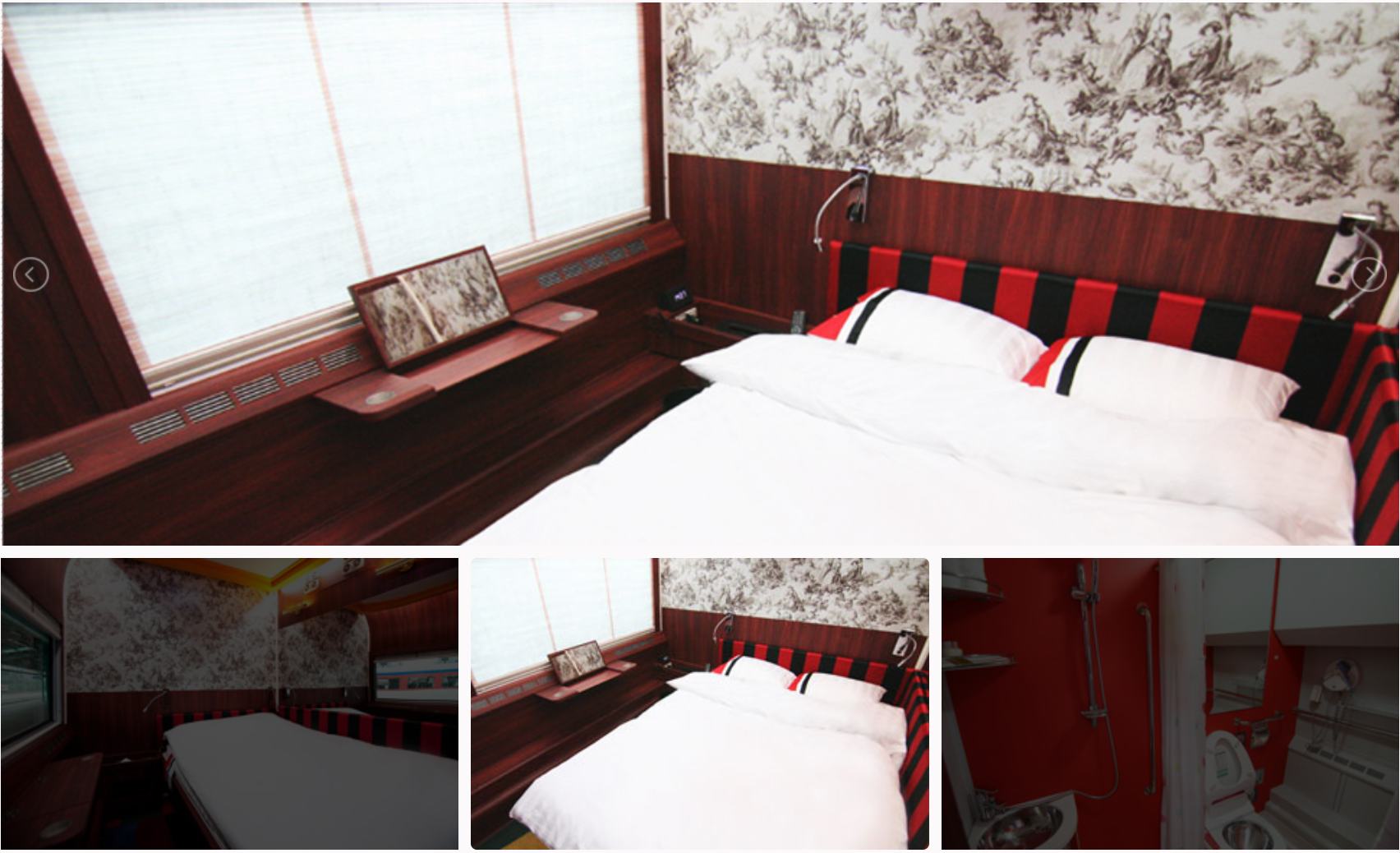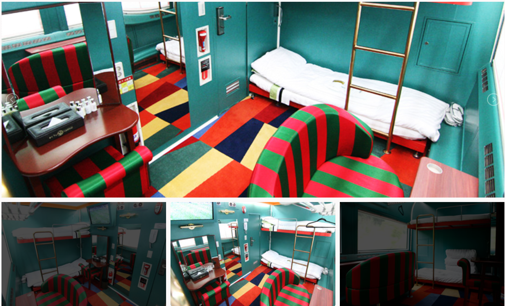 1층 싱글베드(75*185) 2개, 2층 싱글베드(75*185) 2개, 벽면TV, 화장대, 2인용 쇼파, 카드키도어, (화장실과 샤워실은 각 호차에 설비된 공용시설 이용)